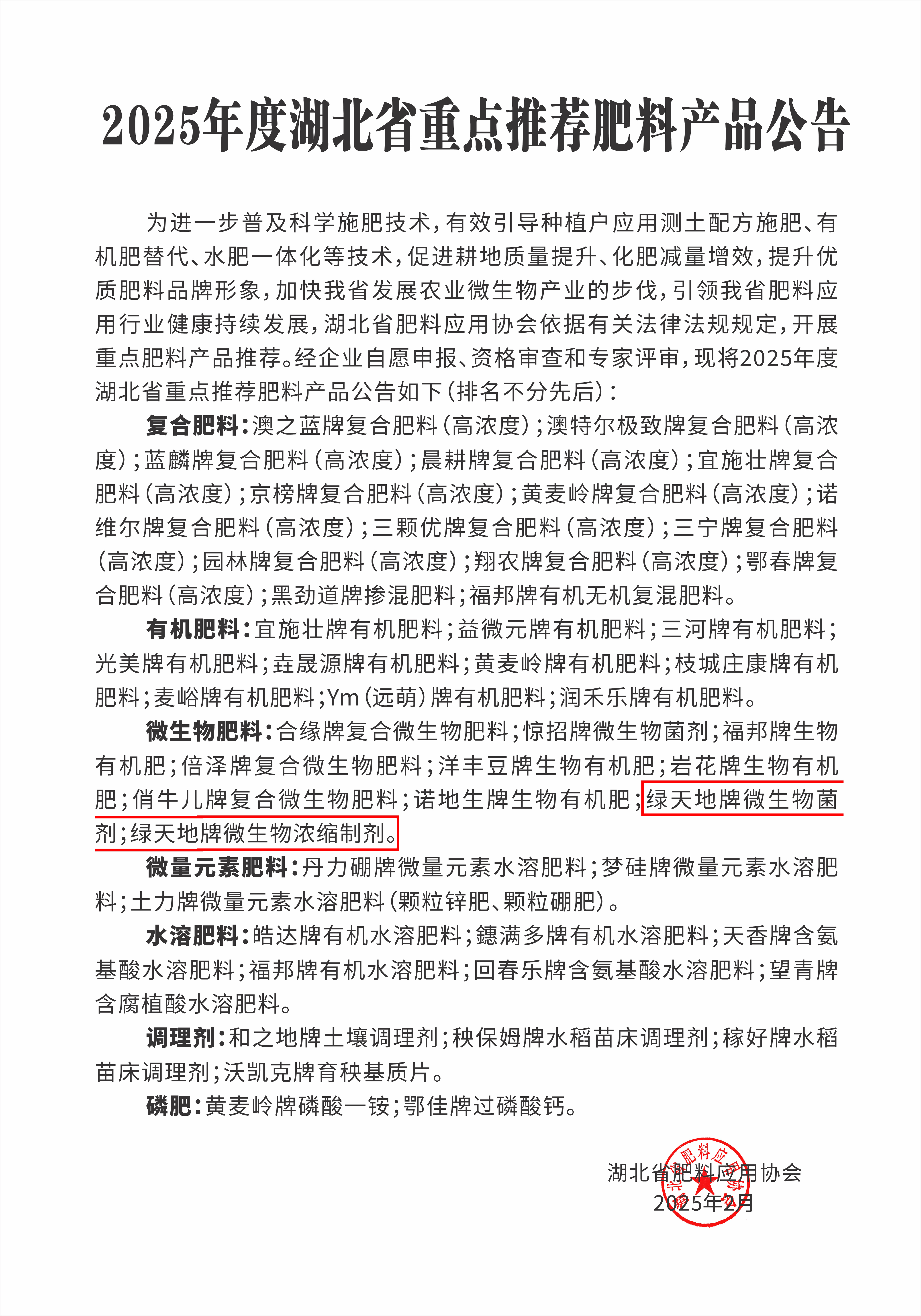 我司產(chǎn)品入選2025湖北省重點(diǎn)推薦肥料名單