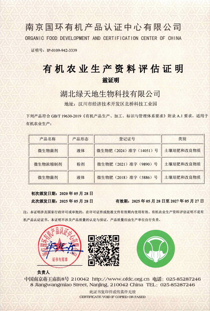 公司5款產(chǎn)品獲得有機(jī)農(nóng)業(yè)生產(chǎn)資料評(píng)估證明