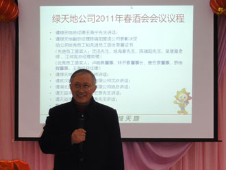 2月18日,綠天地公司2011年度春酒會在漢川市金華天酒店隆重舉行。總經(jīng)理王海寧先生作了2010年公司工作總結(jié)報告并對2011年度的工作作了具體部署。副總經(jīng)理陳端陽宣讀公司表彰決定,公司對2010年度工作表現(xiàn)突出的員工進行了表彰獎勵。董事長林開春先生對公司近期及遠景作了振奮人心的報告。天益豐公司執(zhí)行董事盧曉燕、唐宏泉、羅傳輝先生出席大會并作了重要講話。